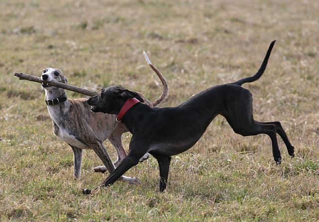 Auf der Rennbahn traf Iuju dann viele nette Whippets, die genau das selbe da hintrieb wie uns - die Whippetmessung. Erstmal spielte sie mit Quincy (Qsar vom Rauhen Meer), den fand sie echt fesch: