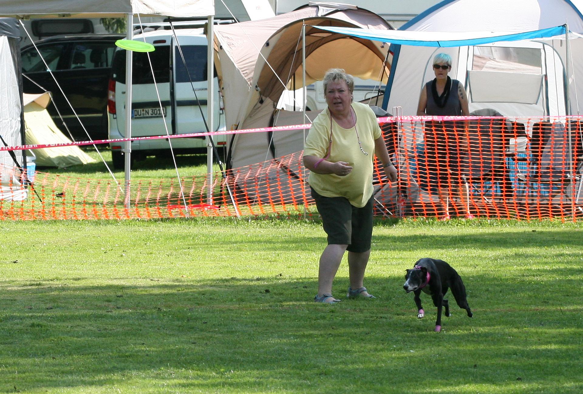 14.07.2018 No flips, no vaults - but fun!Wir mit der bunten Scheibe auf Abwegen :) Wir nutzen ja die Fisbees eigentlich nur zum Sprinttraining für die Whippets, ich muß zugeben, ich kann nicht wirklich gut werfen. Aber nachdem ich die Einladung zu dieser Veranstaltung auf Facebook gesehen hatte, und das Ganze nur wenige Minuten von unserem Wohnort entfernt stattfinden sollte, und uns Evanghelos, der Besitzer von Ecsys Schwester "9", die im Frisbeebereich echt ein Knaller ist und in diesem Jahr wieder ganz heftig nach der Europameisterkrone greift, ein wenig Mut gemacht hatte, habe ich uns einfach mal zum "Eiertanz" angemeldet. Jaja, richtig, Eiertanz